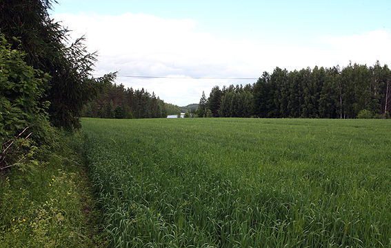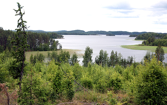 Ritosaaren viljelysmaita, takana näkyy Saimaan vesistöä